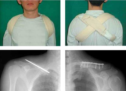 쇄골 골절로 진단된 경우 양 어깨에 8의 모양으로 붕대를 감아 고정하게 됩니다. 대부분의 쇄골 골절은 수술없이도 치료가 가능하다고 알려져 있지만 최근 수술적 치료법의 여러가지 장점이 알려지면서 빠른 회복을 위해 수술적 치료가 선호되고 있습니다. 골절의 형태가 복잡하거나 피부의 손상까지 일으키는 경우, 뼈의 위치의 어긋남이 심한 경우에는 수술이 필요합니다. 수술은 보통 금속판과 나사못을 쇄골에 고정하는 방법을 사용하게 됩니다.